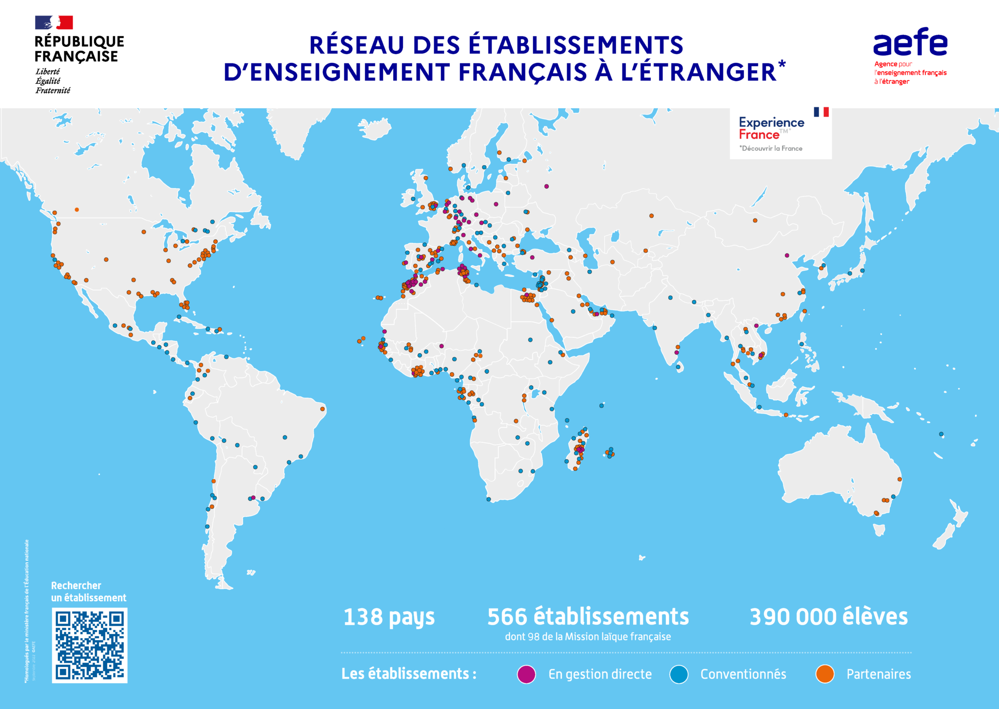 L’AEFE regroupe 600 écoles, collèges et lycées établis hors de France, dans 139 pays, qui proposent un enseignement conforme à l’exigence des programmes de l’Éducation nationale française. Ces établissements homologués sont porteurs de valeurs humanistes – tolérance, égalité filles-garçons, égalité des chances, curiosité intellectuelle, promotion de l’esprit critique… – et permettent de suivre une scolarité sans rupture, de la maternelle au baccalauréat. Forts de leur appartenance à un réseau international dynamique, attractif et ouvert, ils offrent une formation particulièrement enrichissante.